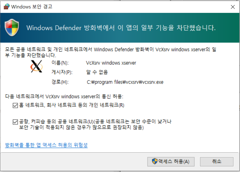 위 단계에서 마침 버튼 누르면 VcXsrv가 바로 실행되고 방화벽 설정 팝업이 뜬다.