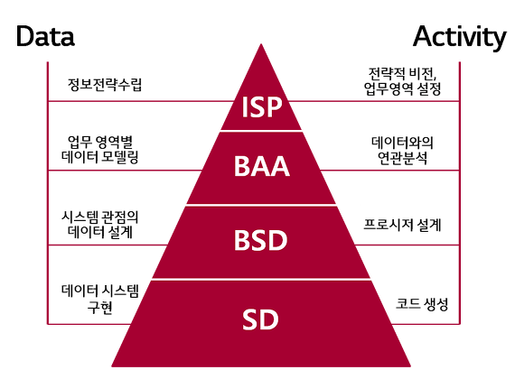 1) ISP : 전사적인 전략과 시스템의 Align 단계 경영전략 분석 -> 현행 업무 프로세스 분석 -> 현행 시스템 분석/평가 -> 아키텍처 개발 -> 전략 계획 (우선 순위 도출) 2) BAA : ISP에서 수집된 자료를 기반으로 세부적으로 확장하는 단계 데이터 모델 다이어그램, 프로세스 분할 다이어그램, 프로세스/데이터 매트릭스 (CRUD 매트릭스) 3) BSD : 비지니스 시스템 설계 ERD, DFD 등의 비지니스 시스템 설계 4) SD : 시스템 설계를 기반으로 정보시스템을 구축하는 단계 연관분석, 물리적 데이터베이스 설계, 코딩등의 작업 수행